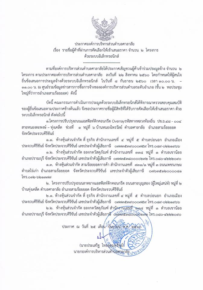 รายชื่อผู้ค้าที่ผ่านการคัดเลือกให้เข้าเสนอราคา จำนวน 2 โครงการ